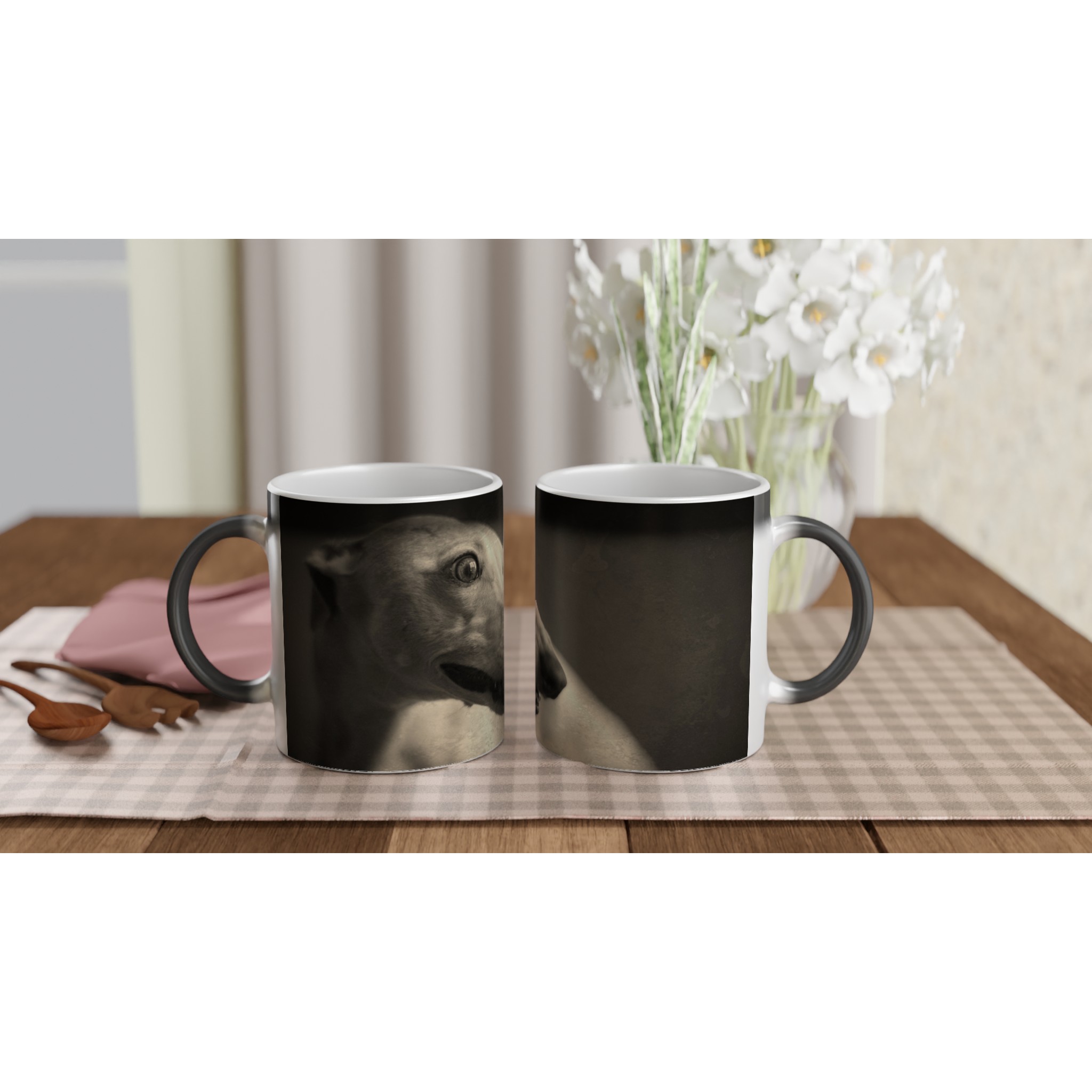 This mug has a black glossy finish when it's empty. When a hot beverage is added, the mug reveals your beautiful artwork.